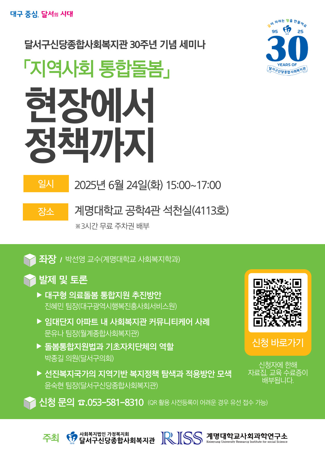 달서구신당종합사회복지관 개관 30주년 기념 [지역사회 통합돌봄, 현장에서 정책까지] 세미나에 초대합니다.