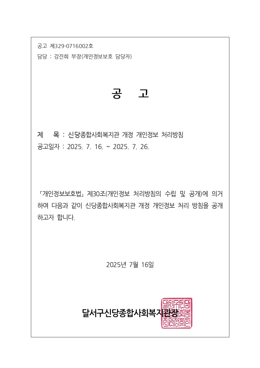 개정 개인정보 처리방침 공고 (개정일: 2025년 7월 15일)