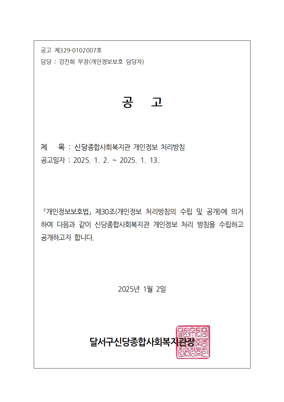 2025년 신당종합사회복지관 개인정보 처리방침 내부 관리계획 수립 및 공고